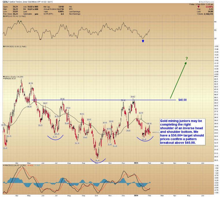 Gold mining juniors may be completing the right shoulder of an inverse head and shoulder bottom. We have a $50.00+ target should prices confirm a pattern breakout above $40.00.