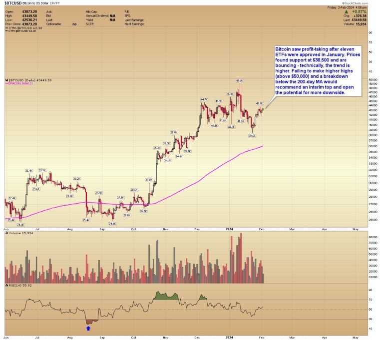 Bitcoin saw profit-taking after eleven ETFs were approved in January. Prices found support at $38,500 and are bouncing - technically, the trend is higher. Failing to make higher highs (above $50,000) and a breakdown below the 200-day MA would recommend an interim top and open the potential for more downside.