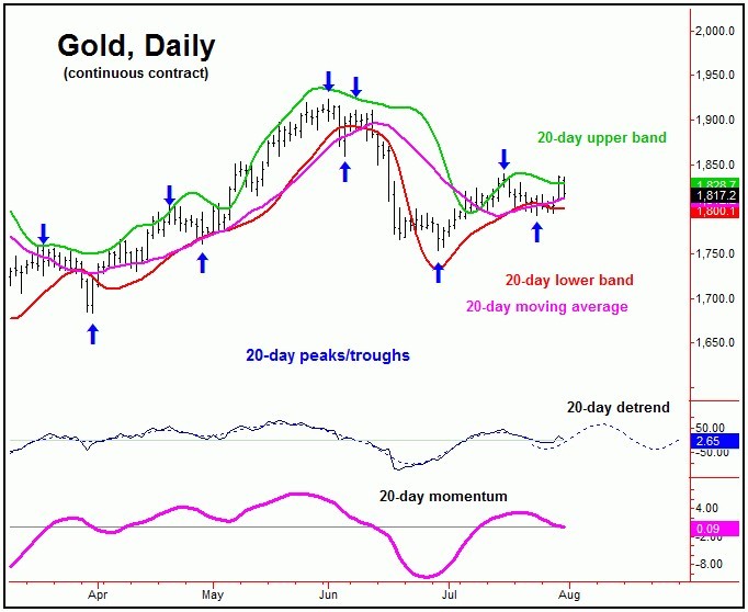 From last Sunday: "the 10-day wave is now 9 trading days along from its last labeled low, which puts it at or into its normal bottoming range. In terms of patterns, due to the position of a larger 34-day wave, the probabilities tend to favor the downward phase of the smaller 10 and 20-day cycles to end up as a countertrend affair - which simply means Gold should remain above the late-June bottom of 1750.10. If correct, the next short-term rally phase is likely to make another attempt at our key dividing line of 1835.00."