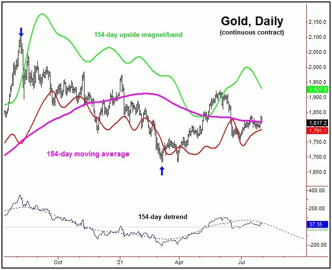 For now, until a higher level materializes, it would currently take a reversal back below the 1754.00 figure (August, 2021 contract) to confirm this 154-day cycle to have topped, thus putting this as the key dividing line for the downside. This number should start to move up in the days/weeks ahead, depending on the action in-between. Stay tuned.