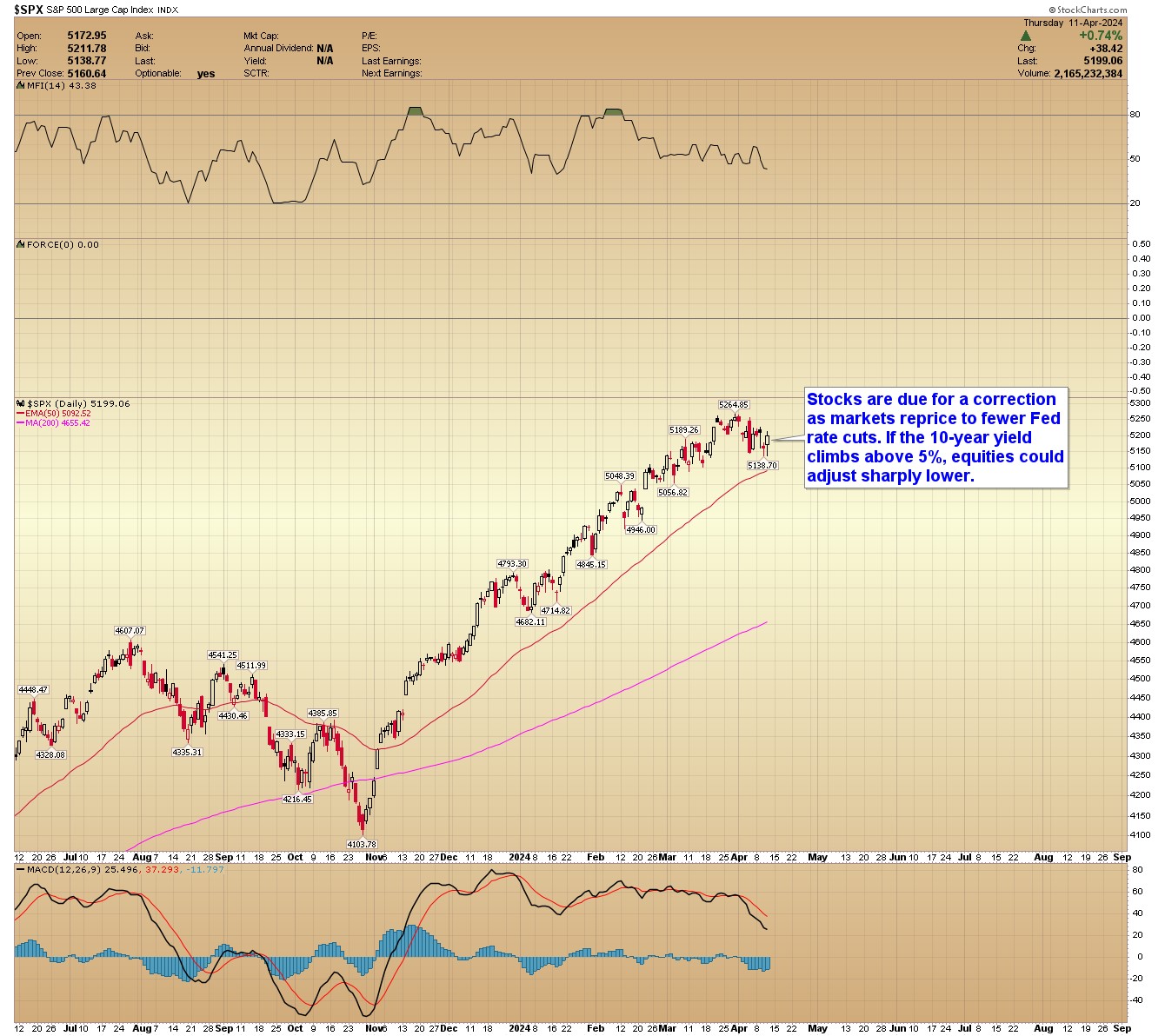 S&P 500- Stocks are due for a correction as markets reprice to fewer Fed rate cuts. If the 10-year yield climbs above 5%, equities could adjust sharply lower.
