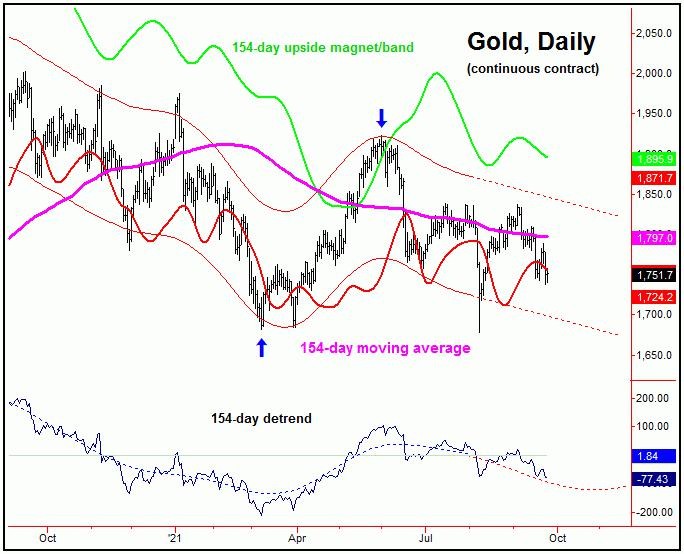 From last weekend: "With the recent daily close back below the 1756.00 figure (December, 2021 contract), the probabilities will now favor the next rally phase with the 10 and 20-day cycles to end up as a countertrend affair, holding below the 1836.90 swing top. If correct, lower lows should continue to play out into the late-October timeframe, where the next 154-day trough is projected to materialize."