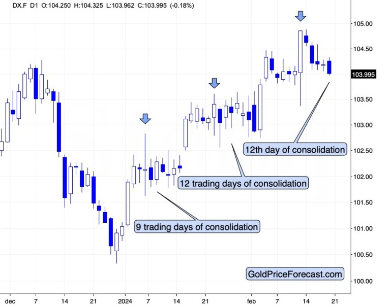 This medium-term rally in the USD Index has quite specific corrections. The pauses that we saw since this rally started took between 9 and 12 trading days and there was a distinct volatile intraday action close to its middle. We saw this kind of action also recently – I marked all of them with blue arrows.
