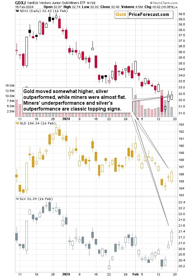 In other words, silver outperformed gold on a very short-term basis, while gold miners lagged.