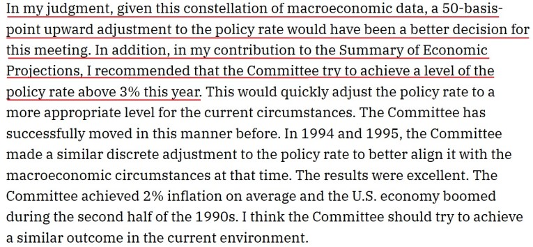 “I dissented with the Federal Open Market Committee (FOMC) decision announced on March 16, 2022, to raise the target range for the federal funds rate by 25 basis points to 0.25% to 0.50%. In my view, raising the target range to 0.50% to 0.75% and implementing a plan for reducing the size of the Fed’s balance sheet would have been more appropriate actions.”