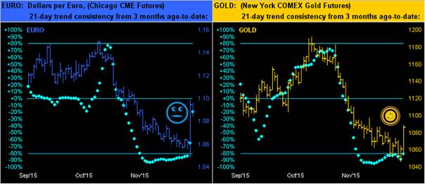 We thus begin our graphics parade with this two panel-view of daily bars for the last three months of the Euro on the left and of Gold on the right. Note those "Baby Blues", the dots which depict the day-by-day consistencies of the respective 21-day linear regression trends. That's one heckova €uroLeap!
