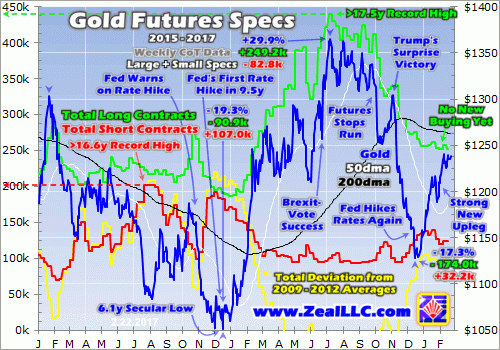 That would trigger gold’s next major upleg after its brutal 12.7% Q4 plunge, one of its worst quarters ever witnessed. But as these charts reveal, gold-futures speculators weren’t ready to buy. With the prospect of the Fed hiking rates three times in 2017, and the US dollar trading near extreme 14.0-year highs on rate-hike hopes, and the stock markets hitting record after record on all the Trumphoria, they didn’t want gold.