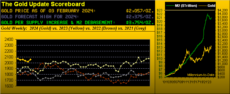 When we last left you a week ago, (albeit given the website’s daily updating we never really leave), we were eying Gold as languishing on a weekly basis, but on a daily basis ’twas set for some bounce. And that’s exactly how Gold ventured through this past week as priced by the ounce. The April Gold contract settled yesterday (Friday) at 2057, a gain for the week of 21 points (+1.0%). However as February’s contract was phased out, an additional +18 points of premium worked into that for April, the “all-in gain” for charting vis-à-vis the “continuous contract” thus +39 points (1.9%). Therefore by such construct, Gold was “saved” from having flipped its weekly parabolic Long trend to Short, as the blue dots below strive to survive yet another week in our year ago-to-date peek: