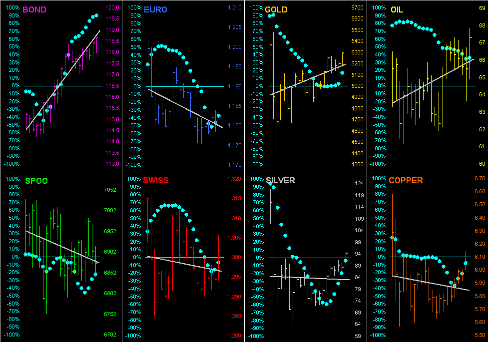 In staying with the theme of the BEGOS Markets, recall a week ago our citing Gold’s 21-day linear regression trend as having rotated (“barely”) to negative, but that a robust up day would right said trend back to positive, which is exactly what happened this past Monday, price recording a net gain for that day alone of +118 points ( +2.3%). And as we thus go ’round the the horn for all eight BEGOS components for these past 21 trading days (one-month), we therein see Gold’s grey diagonal trendline back to a positive tilt, whereas that for Silver remains mildly negative. Of greater import, the “Baby Blues” of trend consistency are firmly rising for both precious metals: