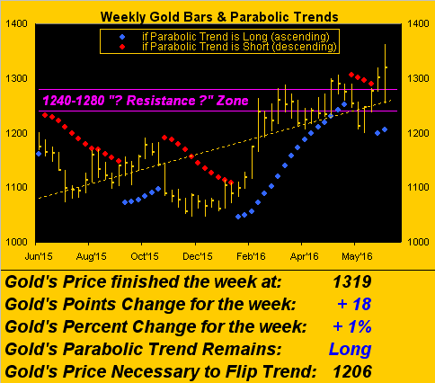 But then from the once-StateSide colonies came the specter of the great Lawrence Peter Berra, his uttering "It ain't over 'til it's over." And as the polls-vindicated referendum results officially hailed Brexit, 'twas the Gold Shorts over whom Gold rolled, price swinging 109 points northward to within 15 of Base Camp 1377, (the session's high coming in at 1362). Thank you Yogi, for 'twas Gold's largest grand slam of the millennium-to-date as measured by intra-session points gained from low-to-high for a net "up" day; on a percentage basis, 'twas the millennium's fourth largest intra-session low-to-high move, again for a net "up" day. As the Gold Dust then settled, price parked itself at 1319, one point above the prior week's high of 1318. Here are the weekly bars from one year ago-to-date: