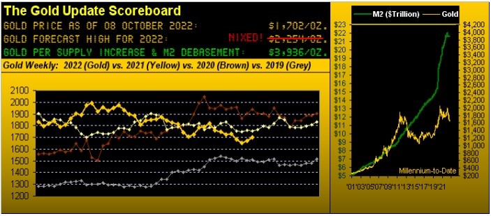 Gold garnered a +2.0% net gain for the week in scrabbling back over 1700 to settle yesterday (Friday) at 1702. Indeed intra-week from low-to-high, Gold gained as much as +4.3% for the first two days, only to halve that in posting net declines these past three days. Regardless, 'twas Gold's first weekly close above 1700 since that ending 09 September, and the fifth-best weekly percentage net gain of the 21 up-weeks year-to-date.