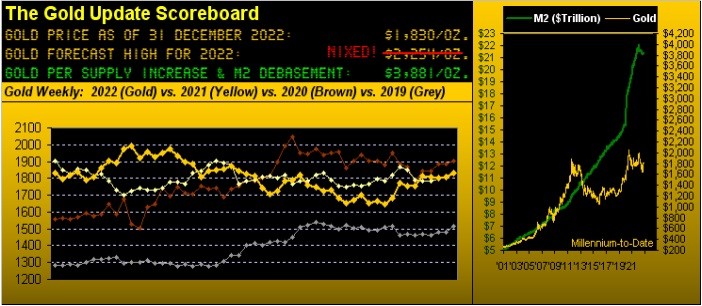 Indeed were that to actually occur in 2023, we'd likely repeat what we've not stated since 2011 about "Gold having gotten ahead of itself". But wouldn't it be lovely. Regardless, should the Gold trade continue as arguably suppressed by those schemingly shifty sovereign/central bank scalawags, 'tis presently unwarranted to make a forecast high for 2023, (our having missed the mark for a price of 2401 in 2021 and for an even more conservative 2254 in 2022). And yet should "they" at some point decide to release the hounds, just make sure you've "Got Gold!"