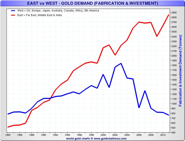 Gold demand particularly for investment purposes has soared in the past few years especially in the East. It has helped offset a decline in demand in the West. The rising demand in the East has more than offset falling demand in the West. Falling demand in the West has been led by disinvestment from the GLD.
