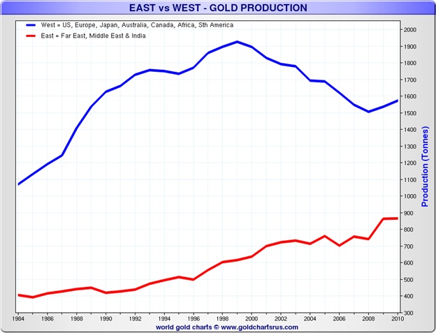 Following years of declining production in the West with flat production in the East production is rising in both East and West once again. However, production turned higher sooner in the East and has gone up faster. China is now the world’s largest gold producer surpassing South Africa and the US. Gold produced in China is not exported as it all consumed in China. Chinese production is estimated to hit 430 tonnes in 2013.