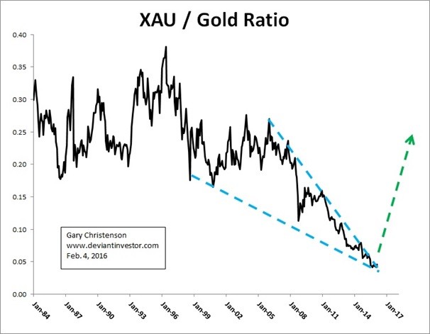 - Examine the 30+ year chart of the monthly XAU (gold stock Index) to Gold ratio. You can see that the downtrend in the ratio has lasted about 20 years – since 1996. The ratio is now at all-time lows in the form of a contracting triangle. The triangle has been broken to the upside.
