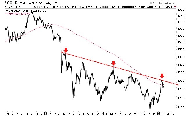 Gold has snapped back after hitting trendline resistance at $1300/oz. Gold is consolidating below the trendline and around its 400-day moving average ($1277/oz) which it has not wrestled with since exactly two years ago. A confirmed break above the trendline and $1300/oz would potentially put Gold on a path to $1400/oz. There is Fibonacci resistance and weekly resistance around $1380-$1390/oz. If Gold can't breakout then look for support around $1240/oz.