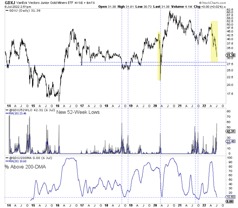 A few days ago, 58% of GDXJ stocks made a new 52-week low. That is tied with the highest single-day mark of the past seven years.