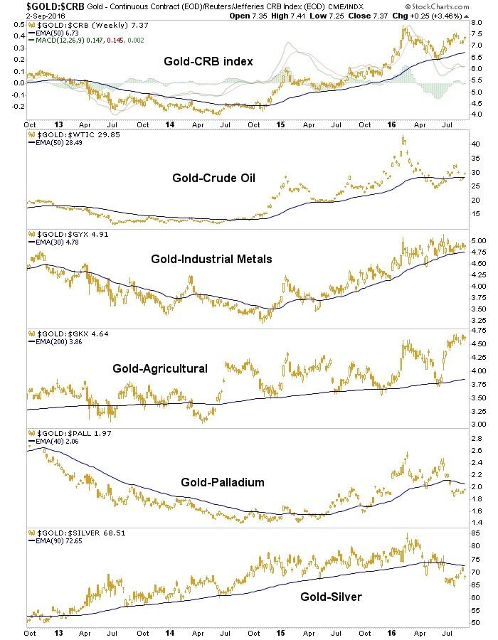 In this post we’ll review two of the charts (gold vs. commodities and gold vs. stock markets) we have used since before the new gold bull market began in order to update some important macro fundamentals. Most of the ratios on these charts have not broken down even as the economy and with it, stock markets have experienced a recent bounce, which we anticipated through various signals belabored repeatedly, since before the BREXIT hysterics.