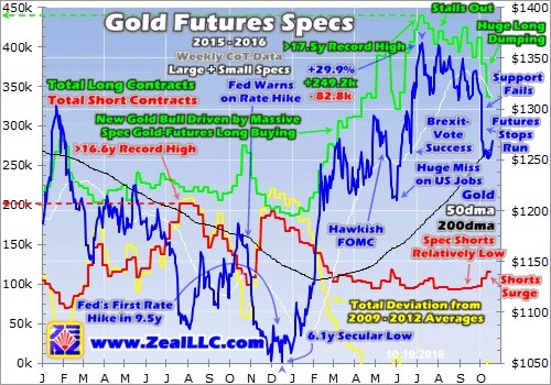 To understand this past week’s super-bullish gold-futures development, it’s necessary to first get some context. Back in early July, total spec longs surged to a staggering 440.4k contracts! Since every one controls 100 ounces of gold, that’s the equivalent of an enormous 1369.7 metric tons. That works out to almost a third of total global gold demand in 2015, a freakishly-huge upside bet given futures’ extreme leverage.