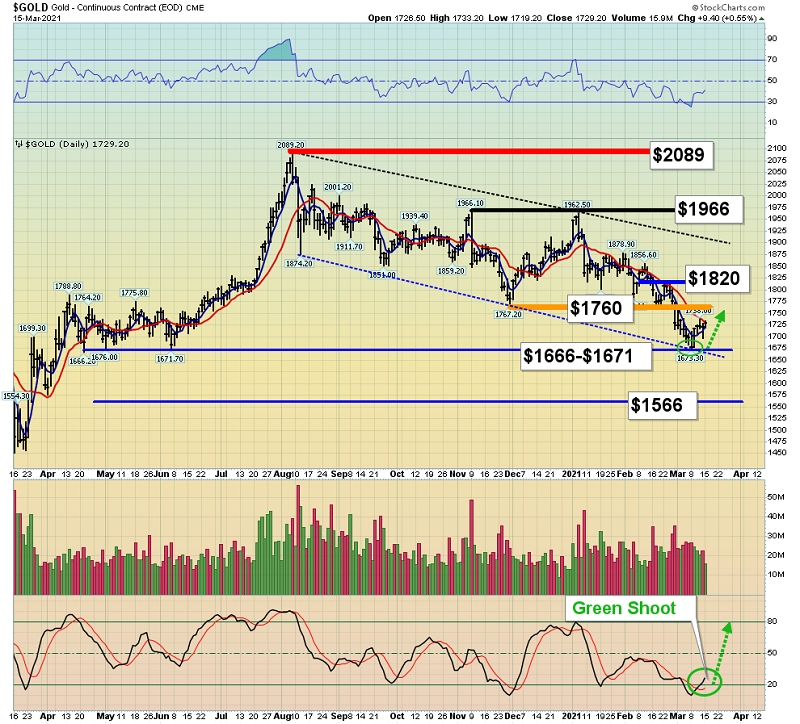 A look at gold’s technical posture going into this key event.The daily gold chart.Note the “green shoot buy signal” in play on the 14,7,7 Stochastics oscillator.