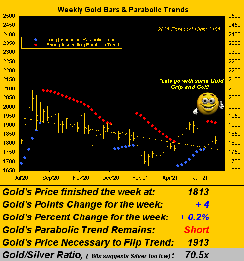 Gold positives-a-plenty, price's weekly parabolic trend nonetheless remains Short, albeit we remain resolved that it be short-lived. To wit: fundamentally, seasonally, debasededly or given any and all of the 3Ds (Debasement / Debt / Derivatives), for Gold we continue to like what we see. No, we don't expect Gold to increase every week as it has done for the past four; but year-over-year, Gold has posted one-week gains of better than 3% -- that's more than 50 points given current levels -- five times. (Recall, too, in the fall of 2007, Gold gained ground for 12 consecutive weeks: that from the "When it Goes, It GOES! Dept."). All noted, Gold settled the week yesterday (Friday) at 1813, from which we trust 'twill show more grip and go: