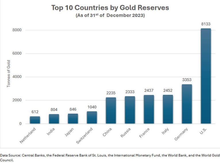 "Gold still represents the ultimate form of payment in the world as gold is always accepted," stated former Fed Chair Greenspan. Central banks have been buying gold at record levels in the last two years, with purchases of over 1,000 tonnes yearly in 2022 and 2023 alone, accounting for about a third of mine production. Some central banks have been aiming to match the reserves of Germany, France, and Italy at 4% of GDP. This gold rush resulted in a record 1,136 tonnes being acquired by central banks in 2022. The BRICS too were big buyers as some sought to avoid Russia-style sanctions as well as diversify their holdings to avoid further dollar debasement. Poland purchased 300 tonnes boosting holdings to 3% of GDP. Bank of Mongolia bought 16 tonnes. Ironically, with no gold in its reserves, gold-producing Canada was conspicuously absent.