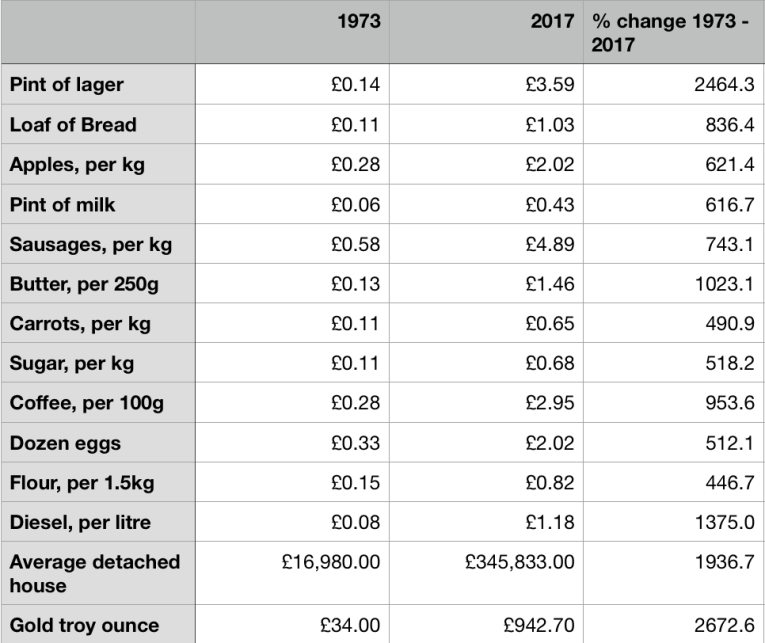 Back in 2014 we wrote about the impact of inflation on household spending and the cost of living due to the devaluation of the pound since 1973. Needless to say three years on that the impact of inflation is even greater and the pound worth even less – especially after sterling’s sharp fall after Brexit.