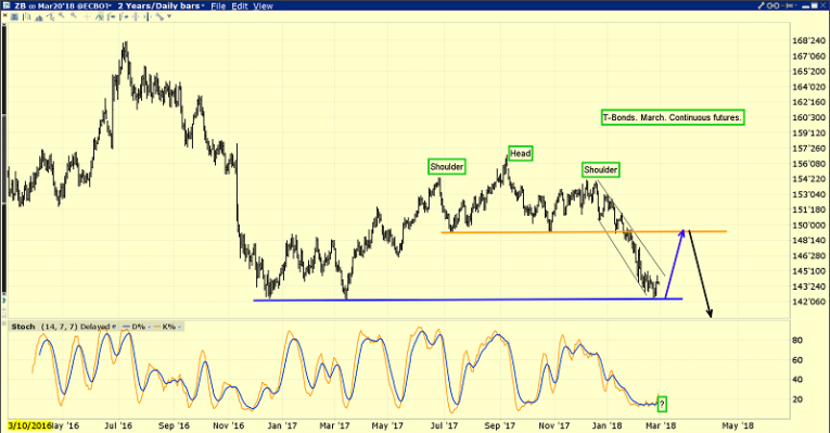The T-bond has arrived in the 142 target zone area of the H&S top pattern and a modest rally is expected. Having said that, fundamentals make charts.