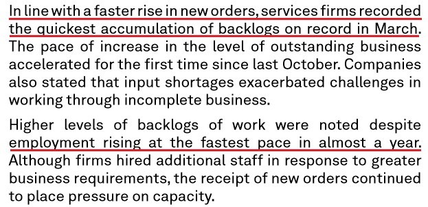 “On the price front, firms recorded a substantial increase in output charges during March. The rise in selling prices was the sharpest on record (since October 2009), as service providers reportedly passed through higher costs to clients, where possible.”