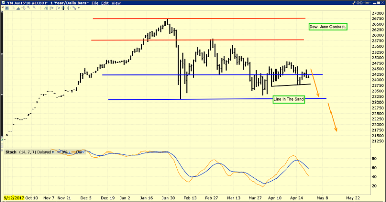 Some Fed speakers have talked about the potential for the central bank to become more aggressive, given the inflationary implication of tax cuts coming at this late stage of the business cycle. If Powell himself makes any such statement this week it could create an institutional investor panic. That would likely send the Dow tumbling under my line in the sand zone.