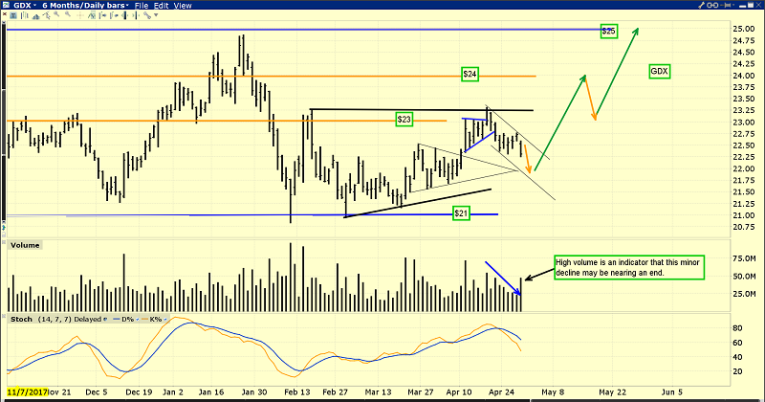 Yesterday’s high-volume day should be noted. Days where volume spikes tend to suggest a minor trend rally or decline is almost finished. Some GDX components (like Barrick) have soared higher while bullion has swooned. That hasn’t happened in a meaningful way since the heady inflationary days of the 1960s and 1970s. The inflation that will be created by launching tax cuts in the late stage of the business cycle is only beginning, and investors need to get positioned in gold stocks now to benefit.
