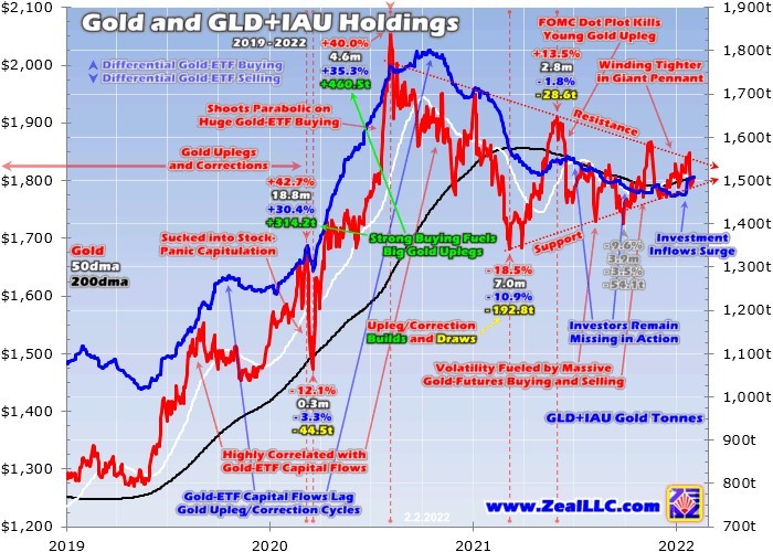 The latest covering Q4’21 was just released last Friday, revealing a huge 117.5% year-over-year jump in overall world gold investment demand last quarter! That was fairly surprising given gold’s good-but-not-exciting 4.1% gain in Q4. Traditional physical-bar-and-coin demand only grew a far-smaller 18.0% YoY, or 48.5 metric tons. The primary driver of that demand surge was a way-bigger 113.7t jump in gold-ETF demand.