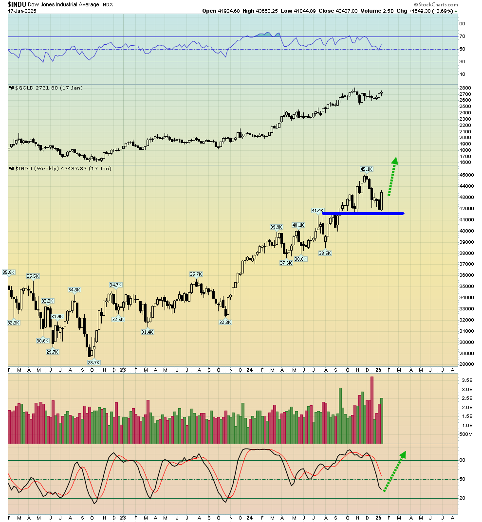 Here’s a snapshot of weekly chart Stochastics (14,5,5 series) for gold. While there could be a dip down to the oversold zone at 20, the sharp buy signal in play at the momentum zone of 50 suggests a major surge higher for the price of gold is most likely.