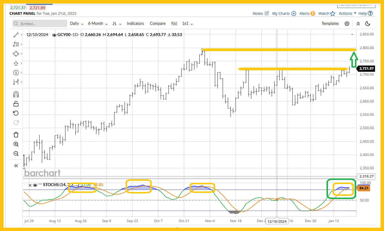 Having said that, gold’s third arrival at the $2720 marker could be the last one before a surge higher begins… and Stochastics also tends to be overbought when such a key breakout is at hand.