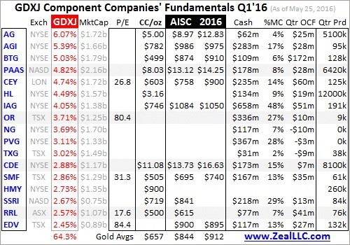 Nevertheless these GDXJ components are the definitive list of elite “junior golds”, so I dived into all of their Q1’16 reports just released by mid-May. Each of these top 34 components’ stock symbols, exchange listings GDXJ is using, GDXJ’s weightings as of this week, market caps, and P/E ratios are listed below. That’s followed by their cash costs and all-in sustaining costs per ounce in Q1’16, and full-year AISC guidance.