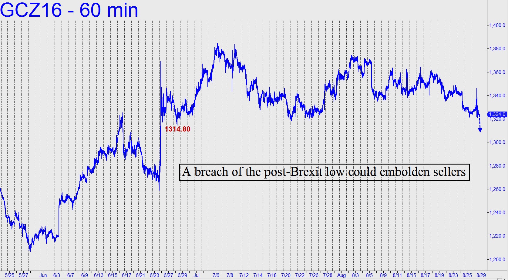 If the downtrend exceeds the post-Brexit low at 1314.80 recorded on June 28, it is going to stop out some bulls, which paradoxically would be bullish, but it could also embolden sellers. The best way to determine which is likely to prevail is to simply monitor ‘impulse legs’ in both directions as they develop on the lesser charts. If bulls are going to regain the upper hand, we should see minor abc corrections fail to reach their d targets, and rallies exceed theirs. Whatever’s ailing gold, it’s nothing that a thrust this week exceeding August 16’s 1364.30 peak wouldn’t cure.