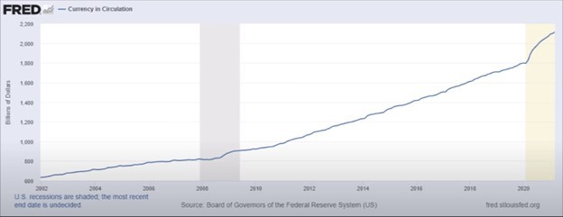 Thus, despite the fictional “distant future” and “economic growth” of which Powell spoke above, we see an all too real distant future of increasing debt, increasing money supply and hence increasingly open and obvious currency debasement.