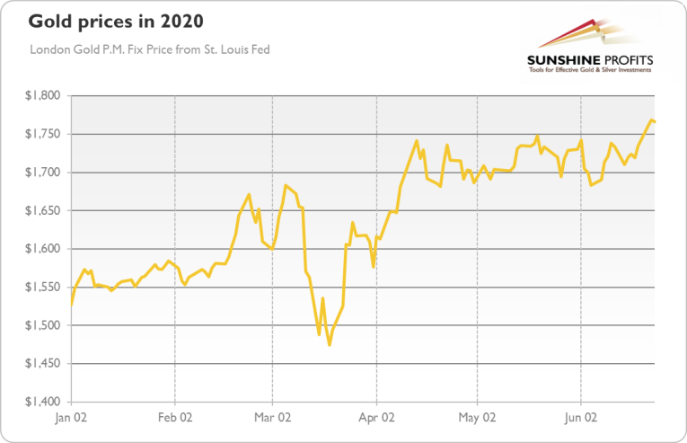 And the coronavirus crisis will also generate medium-term challenges, as we repeated many times. In particular, the already high indebtedness will become even higher. According to the IMF, the public debt will reach this year the record high level, in both developed and developing countries. The global public debt is forecasted to jump above 101 percent, almost 20 percentage points above 2019 level. Such an abrupt rise increases the odds of a sovereign debt crisis and pressure for interest rates to remain at ultra-low levels. Such environment looks fundamentally positive for the gold prices.