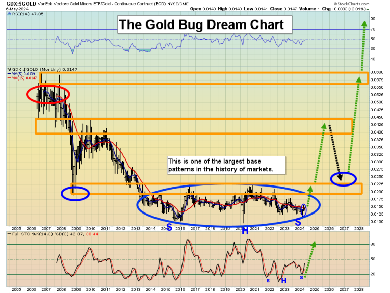 This is the spectacular gold stocks versus gold chart. One of the largest base patterns in the history of markets is in play, and the rise from the right shoulder low has commenced. It’s in sync with what I’ve suggested will be a Chindian (China and India) citizen-oriented gold bull era that lasts for at least a hundred years. As it relates to the gold and silver miners, the immortal words of Jim “Mr. Gold” Sinclair may soon be spoken by most of the world’s money managers… and those words are, “We’re compelled to buy!”