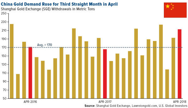 Except for a weak February, demand so far this year has been particularly strong, with monthly withdrawals from the Shanghai Gold Exchange (SGE) above the two-year average of 170 metric tons. April represented the third straight month of rising demand. Withdrawals were 28 percent higher than in the same month in 2017, according to veteran precious metals commentator Lawrie Williams.