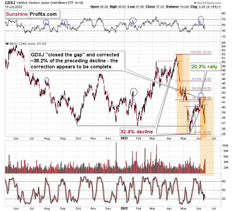 The GDXJ ETF declined by 32.4% and then corrected – it rallied by about 20.3%. The corrective upswing took 14 trading days.