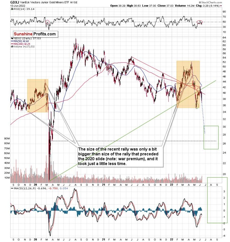 Now, since the general stock market is about to slide, junior miners might be affected even more than gold, so it would make sense for one to expect them to decline somewhat more than gold (compared to what happened in April and May).