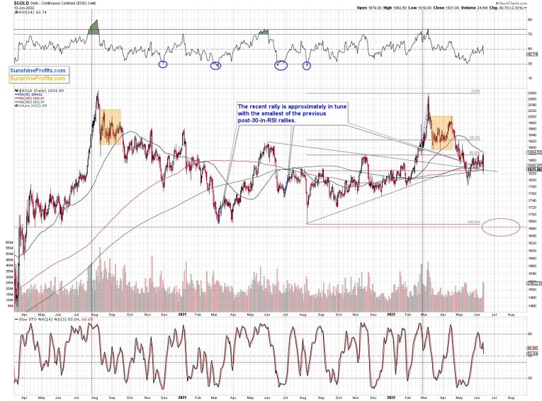 In the case of gold, a repeat of the April-May decline would imply a move to very strong support – the mid-2020 and 2021 lows. Prices below $1,700 stopped gold’s declines several times, and that would make at least a rebound likely once it’s reached that level.
