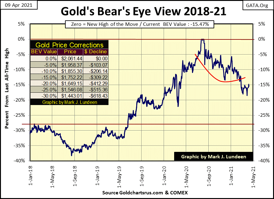But take a good look at the gold’s BEV chart above. For the past eight months; from its August 2020 last all-time high (BEV Zero) to this week’s close, the bears have been unable to get the price of gold to correct by 20%. Looking at the history of the gold market recorded in its BEV chart above; a 20% correction in the gold market isn’t much of a correction. Are the bears in the gold market having problems here?