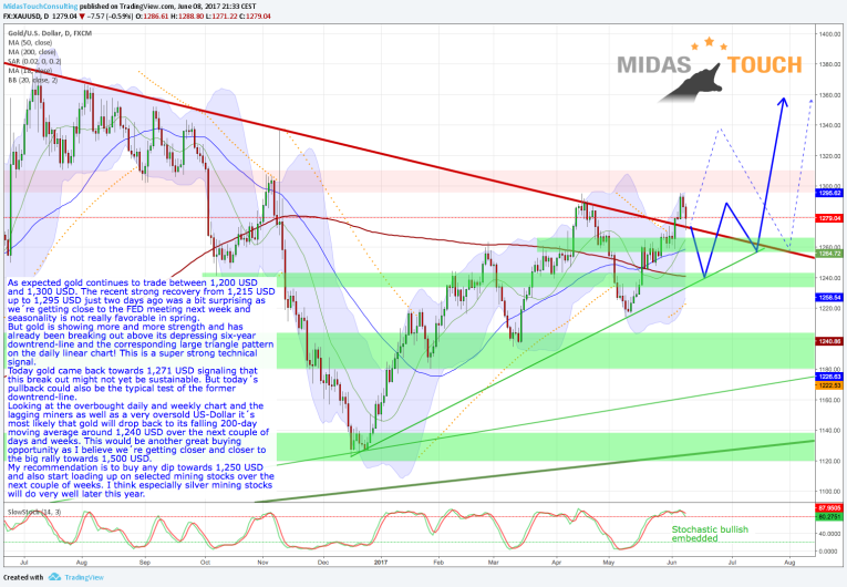 Looking at the overbought daily and weekly chart and the lagging miners as well as a very oversold US-Dollar it´s most likely that gold will drop back to its falling 200-day moving average around 1,240 USD over the next couple of days and weeks. This would be another great buying opportunity as I believe we´re getting closer and closer to the big rally towards 1,500 USD.