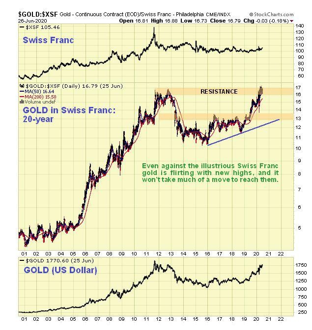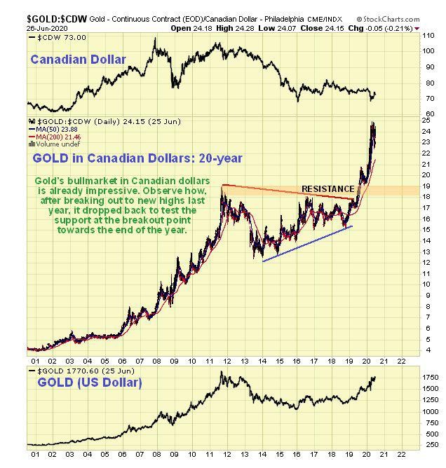 So we should clearly not allow ourselves to be fooled by gold not breaking out to new high against the US dollar, especially given the Fed’s recent extreme profligacy involving the creation of trillions of dollars for the purpose of backstopping the credit markets, bailing out favored crony corporations, and paying countless millions of newly unemployed people to sit at home twiddling their thumbs, none of which can be classified as productive use of the money. All this extra money means that eventually there will be a lot more money chasing the same, or rather a reduced supply of goods and services, now that the economy is a lot less productive thanks to lockdowns and closures etc. The only reason that the Fed has been able to get away with it so far without rampant inflation is because the economy is dead, so there is no money velocity, but this money will find its way out eventually and when it does we will be looking at robust inflation trending towards hyperinflation. Needless to say this will lead to gold appreciating dramatically against the dollar, as the dollar’s purchasing power shrinks.