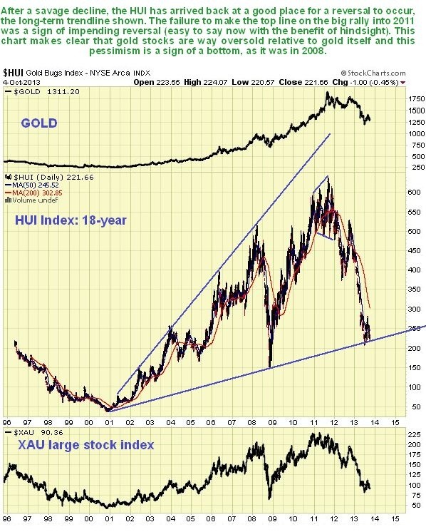 We can see the battering that the PM sector has suffered on the long-term 18-year chart for the HUI index below. It is now not that far above its 2008 panic lows, which means that it is way oversold relative to gold, which is still getting on for twice its price at its 2008 lows. Here we should remind ourselves that at times of extreme optimism characteristic of a top, stocks are more popular than bullion, while at times of extreme pessimism characteristic of a bottom, bullion is more popular than stocks (or less unpopular), which is what we are seeing right now.