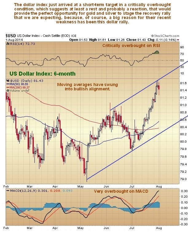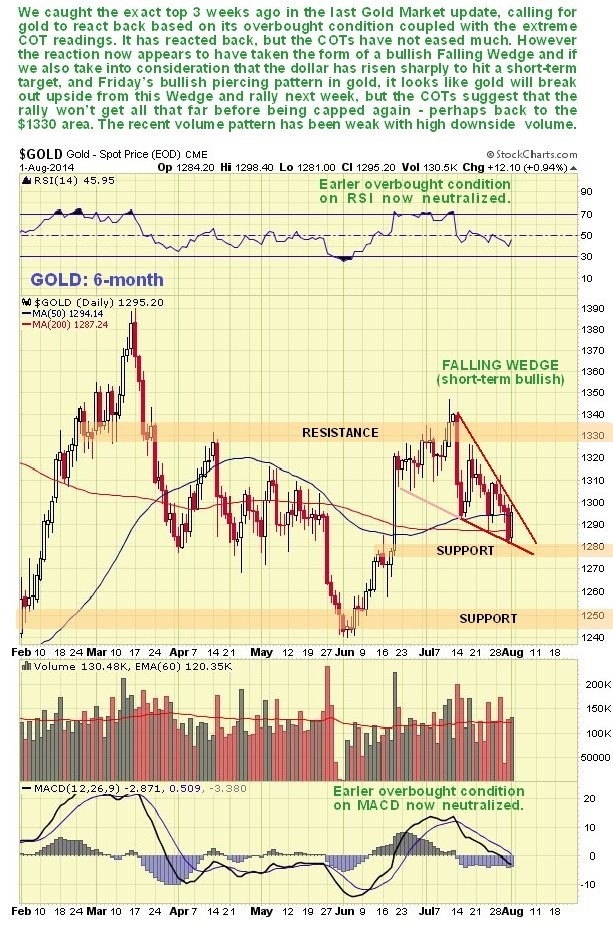 On the 6-month gold chart we can see how the forecast decline was kicked off by a sharp drop, but as it has proceeded it has diminished in force, and it now looks like the minor downtrend has developed into a bullish Falling Wedge. With this Wedge now closing up a breakout and rally looks imminent, made more likely by a “piercing pattern” appearing on the chart on Friday, and also by the strong dollar having hit a short-term target in a very overbought state on Wednesday and Thursday, which we will look at shortly. It was this strong dollar which forced gold and silver lower in recent weeks. Disappointing for bulls, however, is the fact that the extreme COT readings of a few weeks back have not eased off much.