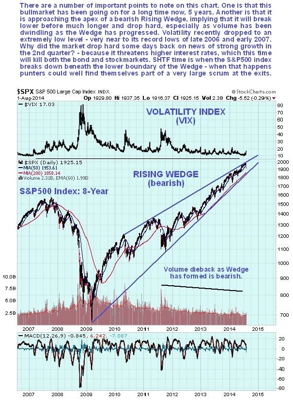 Speaking of the general stockmarket, although it plunged on one day last week, it has still not broken down from the giant bearish Rising Wedge shown on the 8-year chart for the S&P500 index below. When that happens, and it looks likely soon given that the Wedge is now closing up, a lot of market players can be expected to jam the exits, all trying to get out at once, and we could see a particularly disorderly situation and a savage decline. It is considered prudent to get your bear ETFs and Puts on board ahead of time. We will be looking at some soon on the site.