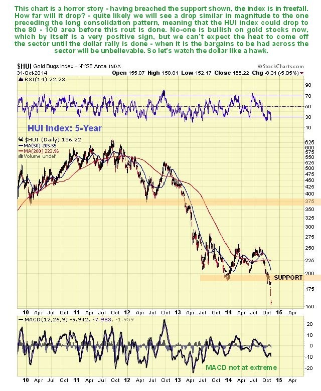 Despite already being monstrously oversold relative to bullion, gold stocks were “taken to the woodshed” yet again last week as a result of gold and silver breaking lower, and suffered further heavy losses, as we can see on the 5-year chart for the HUI index shown below. They are now in freefall, and clearly, if gold now drops to its big support in the $1,000 area, they can be expected to continue to plummet, and it is reasonable to expect to see a downleg of similar magnitude to the one that lead into the big consolidation pattern of the past 15-months.